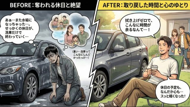 この記事を読むことで、洗車にかかる時間を大幅に短縮し、水垢のストレスから解放され、